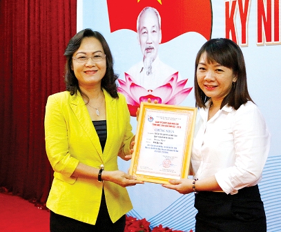 | Đồng chí Lê Thị Ái Nam, Phó Bí thư Thường trực Tỉnh ủy, Chủ tịch HĐND tỉnh trao giải cho tác giả đoạt giải Nhất Giải Báo chí truyền thống tỉnh Bạc Liêu năm 2018. Ảnh: H.T |