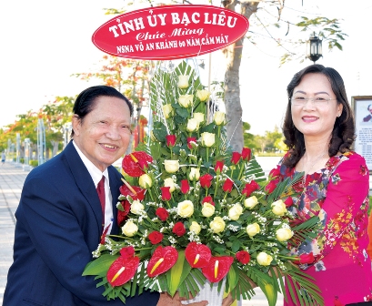 Bà Lê Thị Ái Nam, Phó Bí thư Thường trực Tỉnh ủy, Chủ tịch HĐND tỉnh tặng hoa chúc mừng NSNA Võ An Khánh nhân triển lãm ảnh Tư liệu - Nghệ thuật kỷ niệm 42 năm Ngày giải phóng miền Nam (30/4/1975 - 30/4/2017) và 60 năm cầm máy của NSNA Võ An Khánh. Ảnh: Thanh Cường